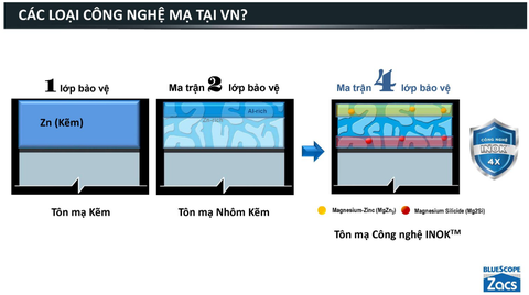 Công nghệ INOK™ được phát minh và đăng ký bản quyền bởi tập đoàn BlueScope Úc lần đầu tiên ứng dụng cho các sản phẩm tôn Zacs®+ tại Việt Nam. Công nghệ INOK™ tạo lớp mạ vi cấu trúc với 4 lớp ma trận bảo vệ hoàn hảo; giúp chủ động ngăn ngừa rỉ sét đỏ, đặc biệt tại mép cắt, lỗ vít và vết trầy xước**.