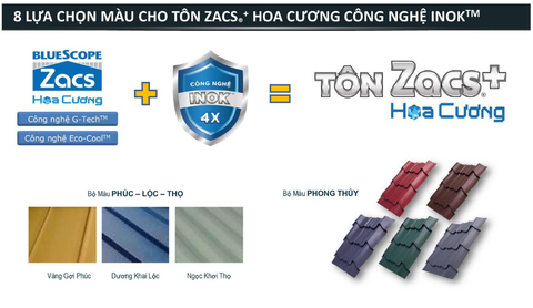 Tôn Bluescope Zacs gồm (5 màu) và bộ màu Phúc Lộc Thọ (3 màu) giúp bạn thoải mái lựa chọn màu phù hợp cho không gian sống của mình tạo sự hoàn hảo, thoải mái
