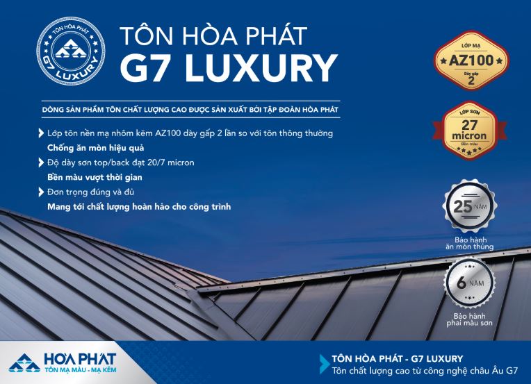 Tôn hòa phát luxury G7 là dòng tôn cao cấp với chất lượng vượt trội, độ dày lớp mạ AZ100 gấp đôi so với sản phẩm tôn thông thường khác, chế độ bảo hành 25 năm chống ăn mòn thủng. Sản phẩm sử dụng nguyên liệu sơn từ các nước G7 với màu sắc bắt mắt, độ dày sơn cao nhất trên thị trường hiện nay: đạt 20/7 micron, thời gian bảo hành màu 6 năm, giữ màu sắc lâu dài, bền màu vượt thời gian.